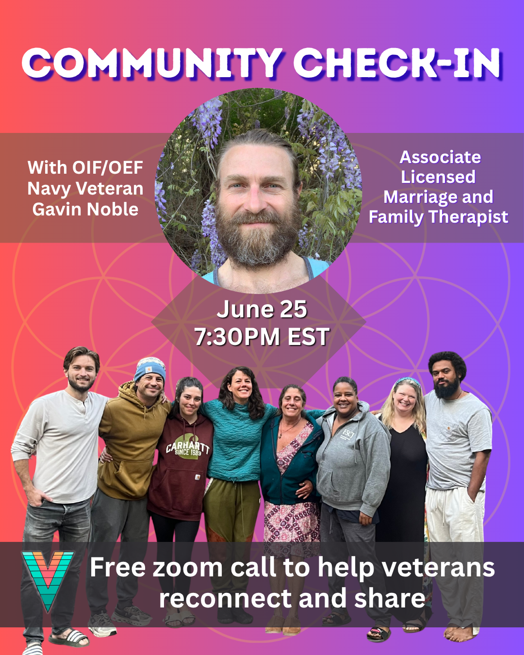 Community Healing Events aimed to Empower the Warrior Spirit Join our zoom call Join our zoom call June 25th Community Check-in💙 Join us on June 25th at 7:30 PM EST for a free Zoom gathering with Visionary Veterans. Let’s connect, share, and support each other. Open to veterans and allies, hosted by Gavin Noble. Join the Zoom Call here! Join the Zoom Call here!